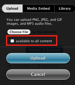 Click on Upload, then Choose File to select an image from your computer. Remember, images must be no bigger than one megabyte in size. Surveydaddy supports gif, jpeg, and png images. If you select the check box to make the image available to all content, the image will be available to all your surveys and quizzes. Leaving the box unchecked means that the image will be available to the survey or quiz you’re working on only.
