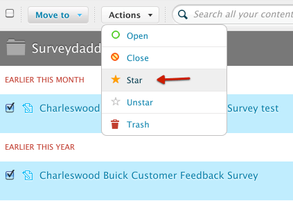 Select multiple pieces of content by checking their checkboxes, then click on the Actions dropdown to Open, Close, Star, Unstar, or send content to the Trash. Learn more.