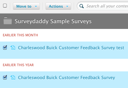 Select multiple pieces of content by checking their checkboxes, then use the Move to dropdown to move multiple pieces of content to a new folder. Learn more.